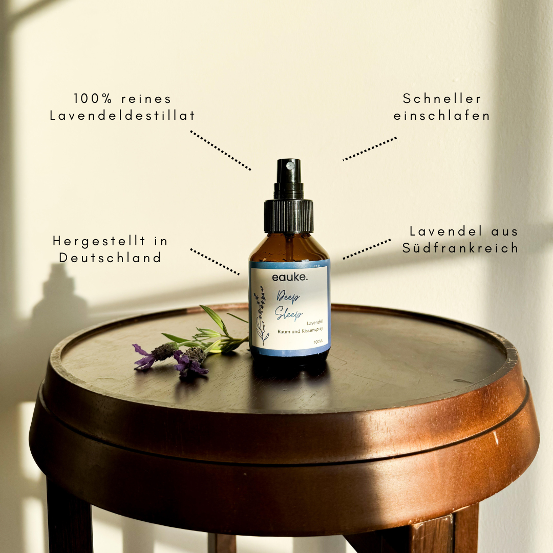Unser Kissenspray optimiert deinen Schlaf. Der Puls wird ruhiger, die Gedanken hören auf zu kreisen. Tiefe Enstpannung für Körper, Geist und Seele.